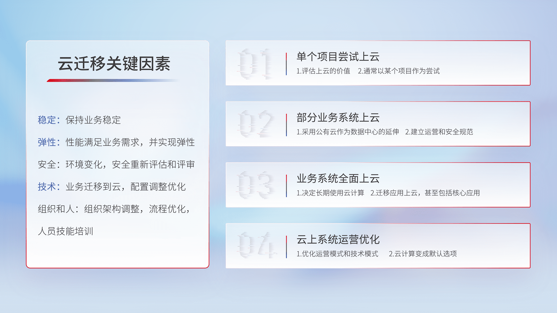 结合实际业务,,,,从规划设计、、、云平台选型、、、、云原生改造、、、数据迁移、、集成交付,,,,迁移全过程为客户识别最佳上云路径,,,,做好风险识别管理,,,设计网络架构、、、、身份权限、、、、安全审计合规、、、、操作审计、、、、日志审计、、、监控告警策略、、多站点容灾设计等,,,,对云上基础设施进行整体规划,,,提升IT治理水平,,,以满足弹性、、、高可用、、高性能的需求。。。