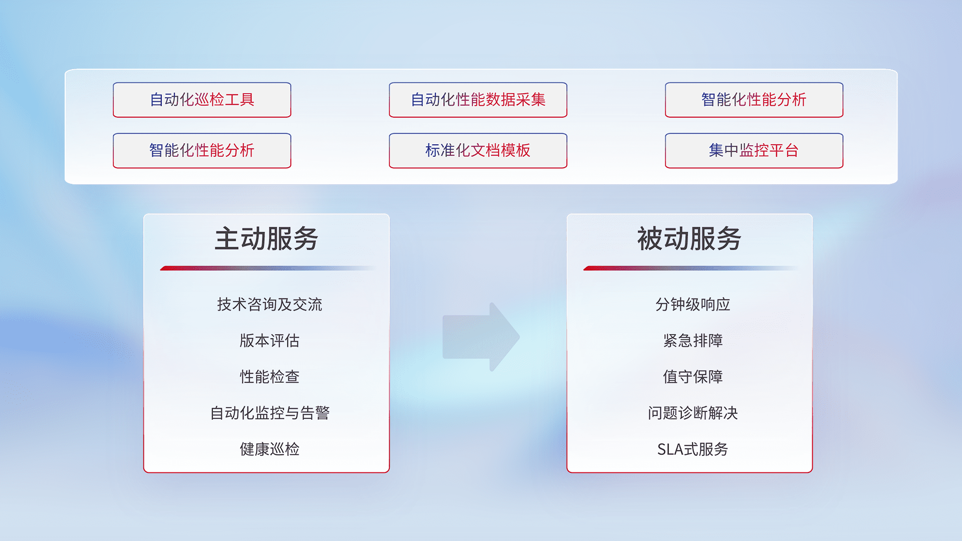 智能化工具和标准化文档,,保障服务质量,,,提供主动服务(包含技术咨询、、版本评估、、、性能检查、、自动化监控与告警、、、健康巡检)和被动服务包含(分钟级响应、、、、紧急排障、、、、值守保障、、、、问题诊断解决、、SLA服务)。。。。